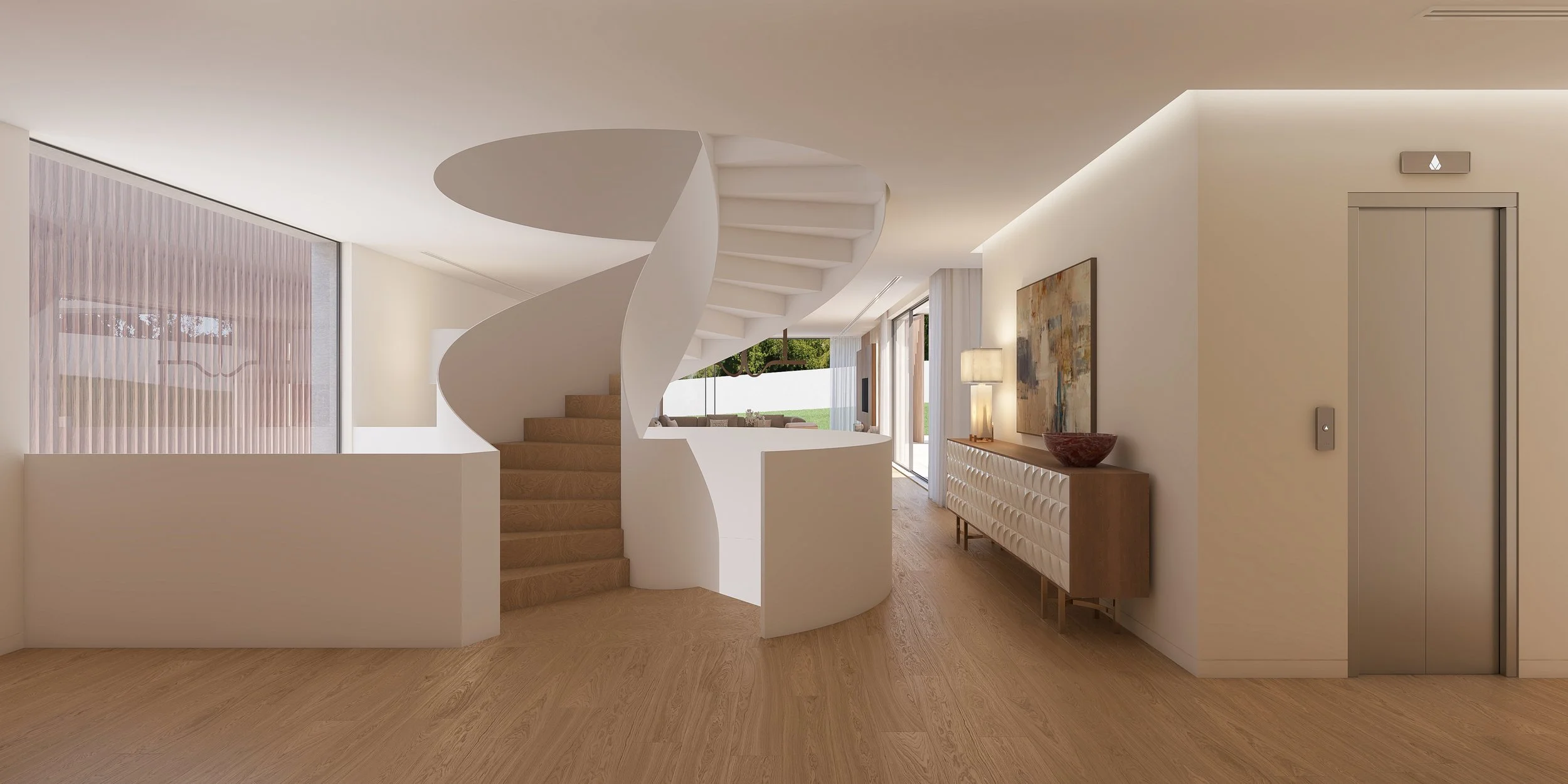 Organizada em três pisos, esta habitação distribui-se de forma a atenuar visualmente a sua volumetria total. O piso superior, recuado, reduz a leitura de uma casa com três níveis e acolhe a garagem e uma suíte com varanda — uma caixa branca que se destaca pela sua leveza formal.